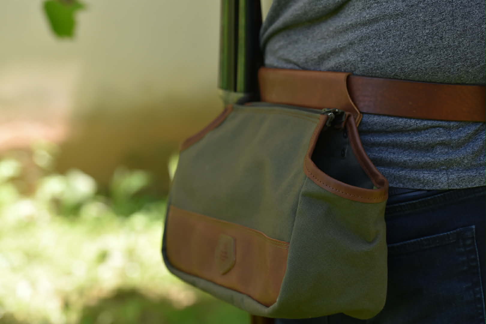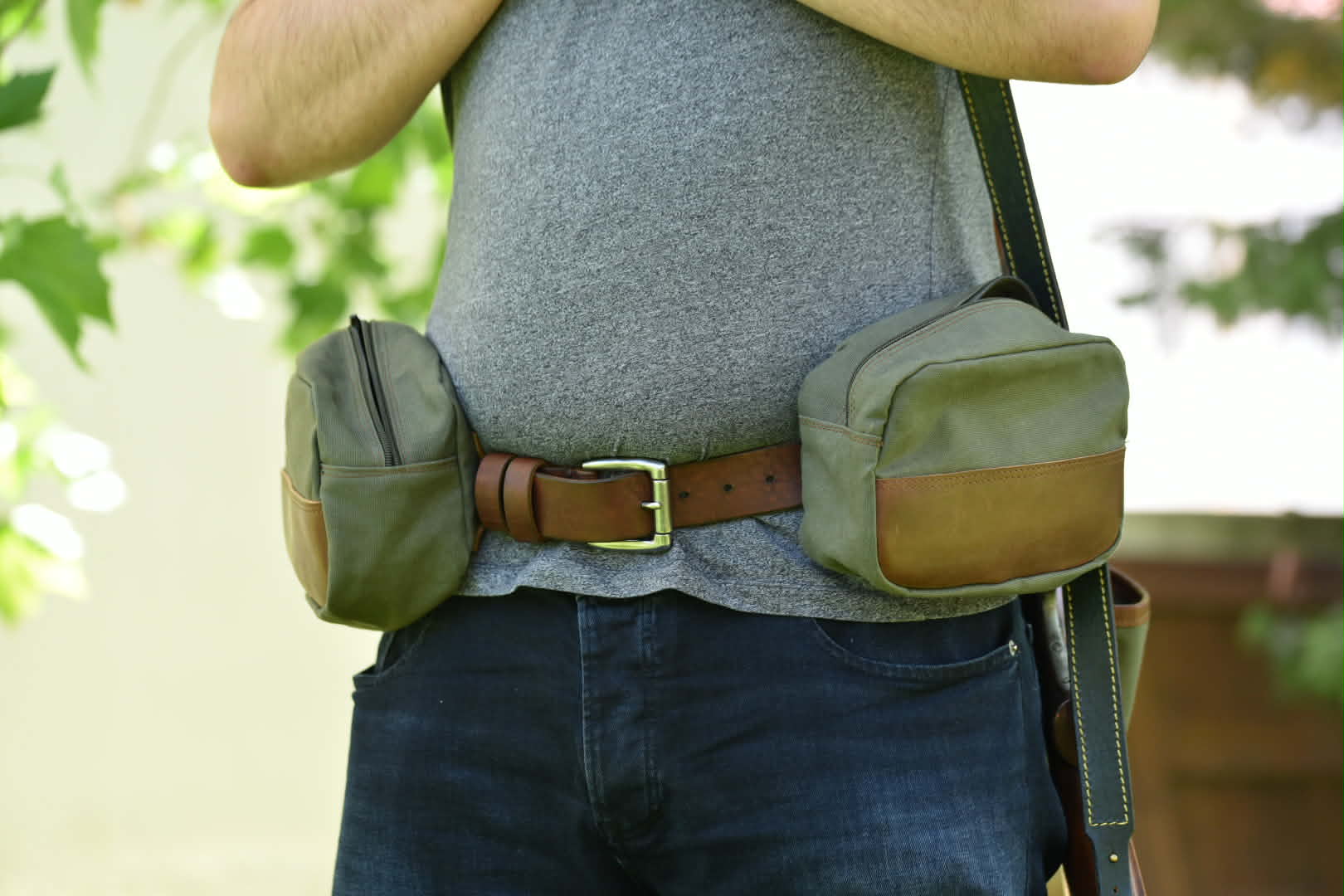 Κυνηγετικό γιλέκο μέσης.Αποτελείται από 2 θήκες που κλείνουν με φερμουάρ και εσωτερικά των θηκών φυσιγγιοθήκη 5 θέσεων. Πίσω θήκη μεταφοράς θηραμάτων επενδυμένη εσωτερικά με αδιάβροχο πανί. Kατασκευή με αδιάβροχο κερωμένο καραβόπανο και δέρμα. Συνοδεύεται από χοντρό δέρμα ζώνη 4 εκατοστά και πάχους 4,5 χιλιοστά δέρμα ταύρου.