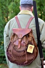 Παραδοσιακό σακίδιο κυνηγίου. Ελληνικό δέρμα φυτικής επεξεργασίας και ελληνικό βαμβακερό καραβόπανο. Εσωτερική τσέπη φύλαξης μικρό-αντικειμένων. Δυνατότητα επιλογής πανιού στο πορτοκαλί χρώμα.