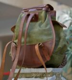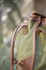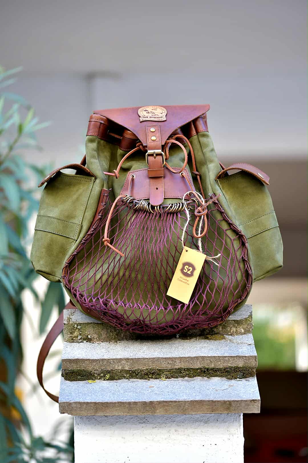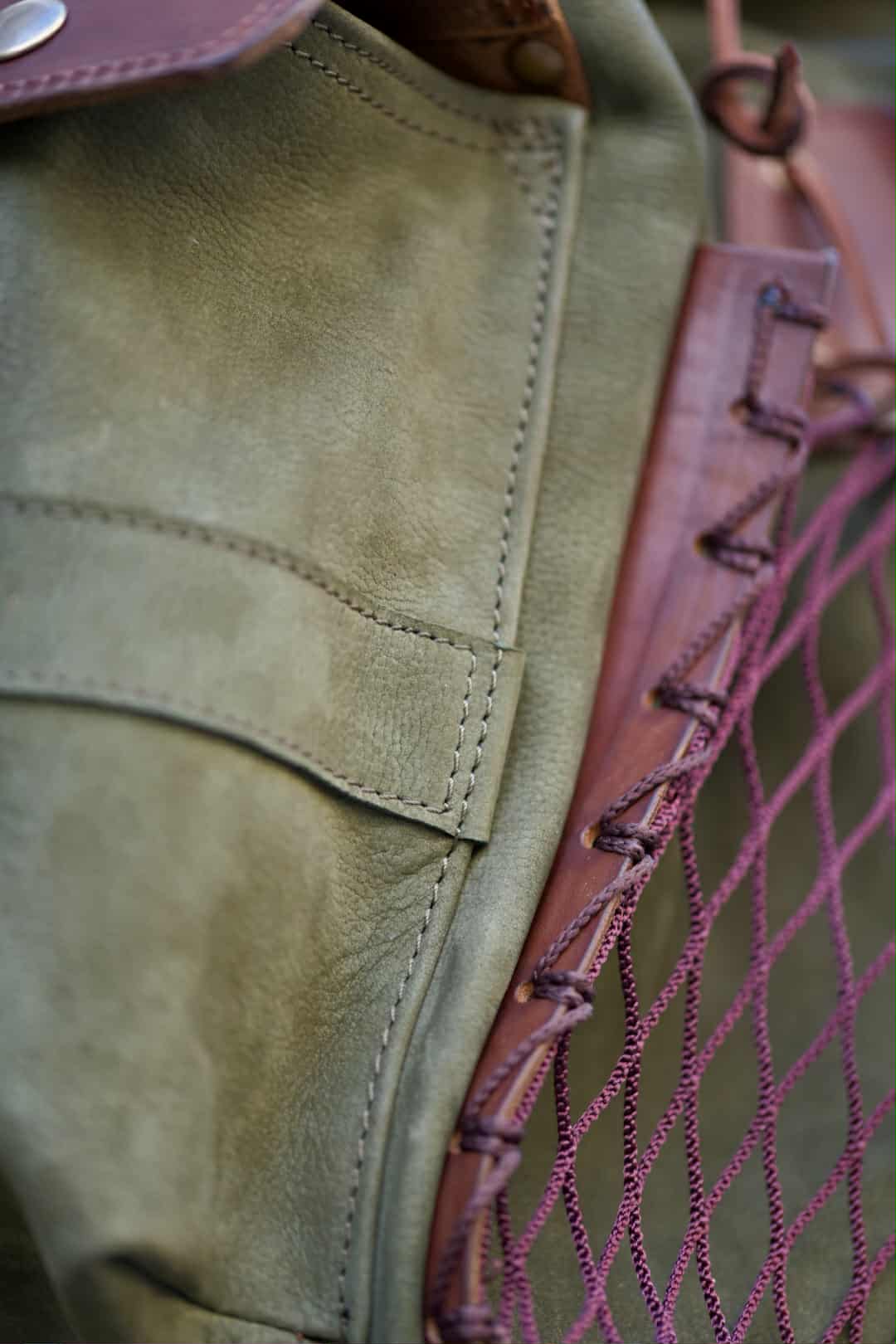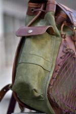 Σακίδιο κυνηγίου με δέρμα ναμπούκ και λεπτομέρειες δέρμα βακέτα. Εσωτερική επένδυση με ύφασμα αλκανταρα.