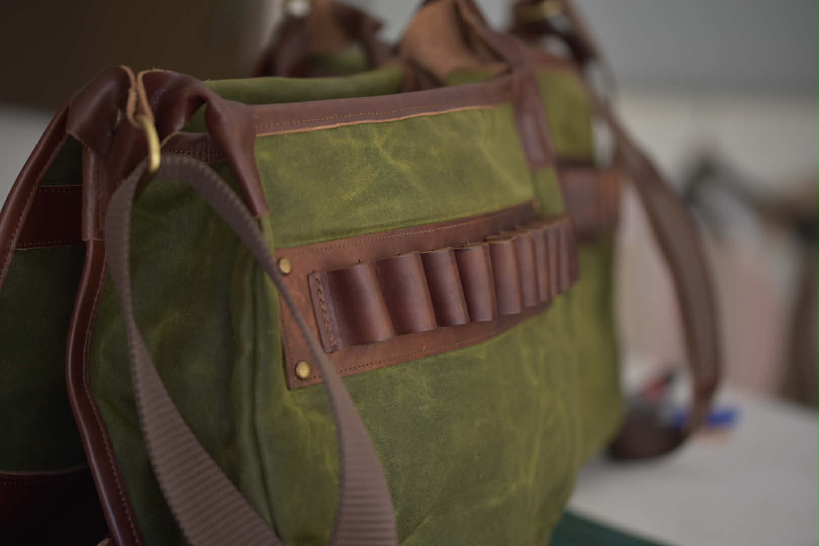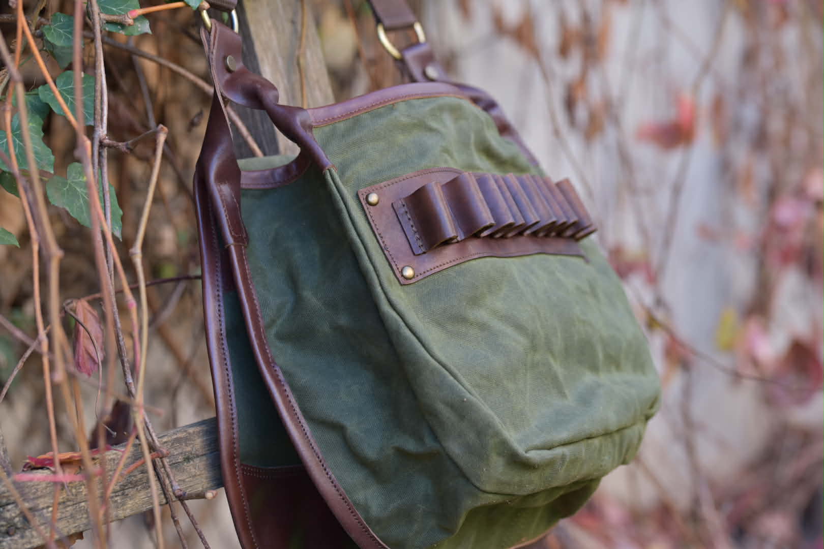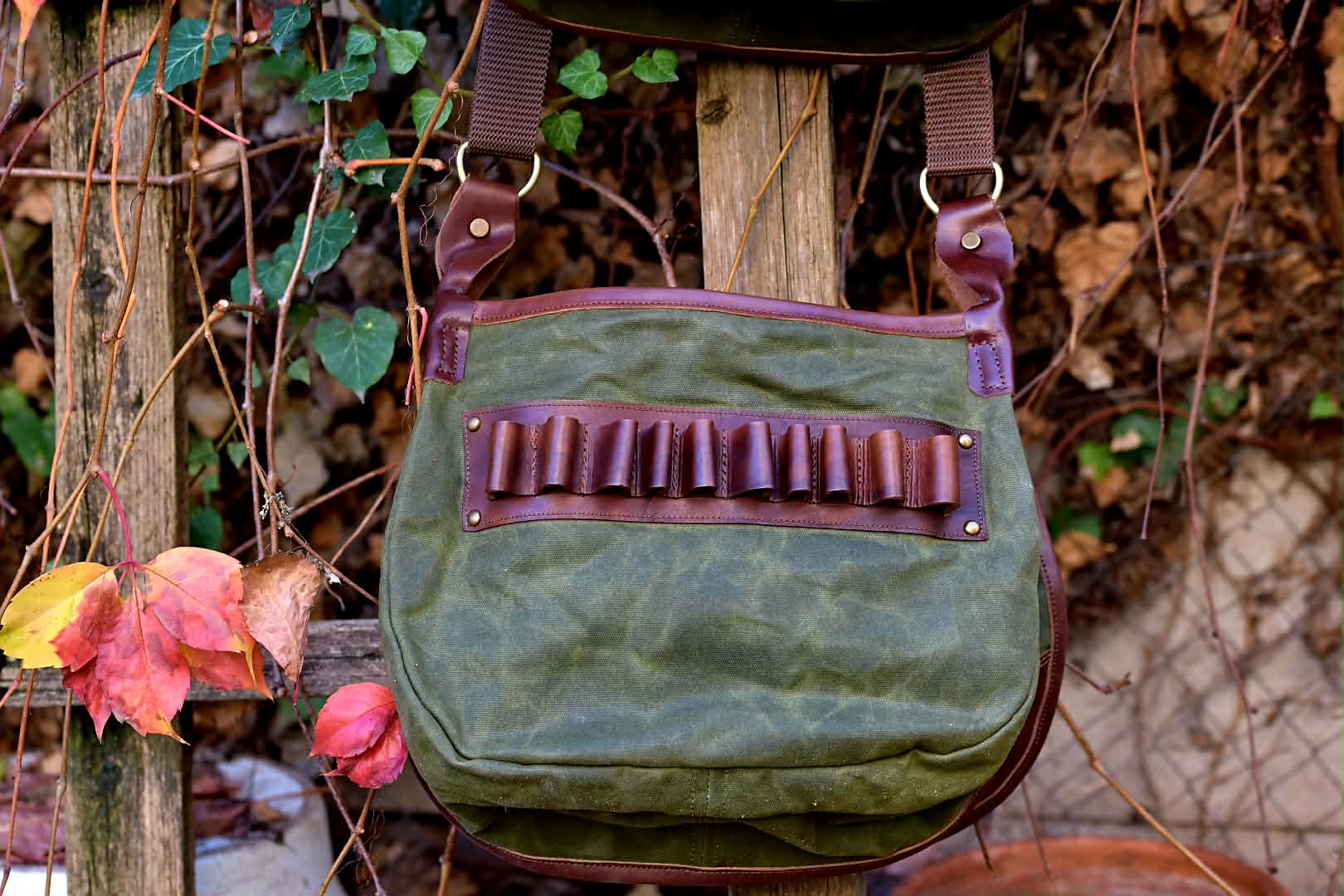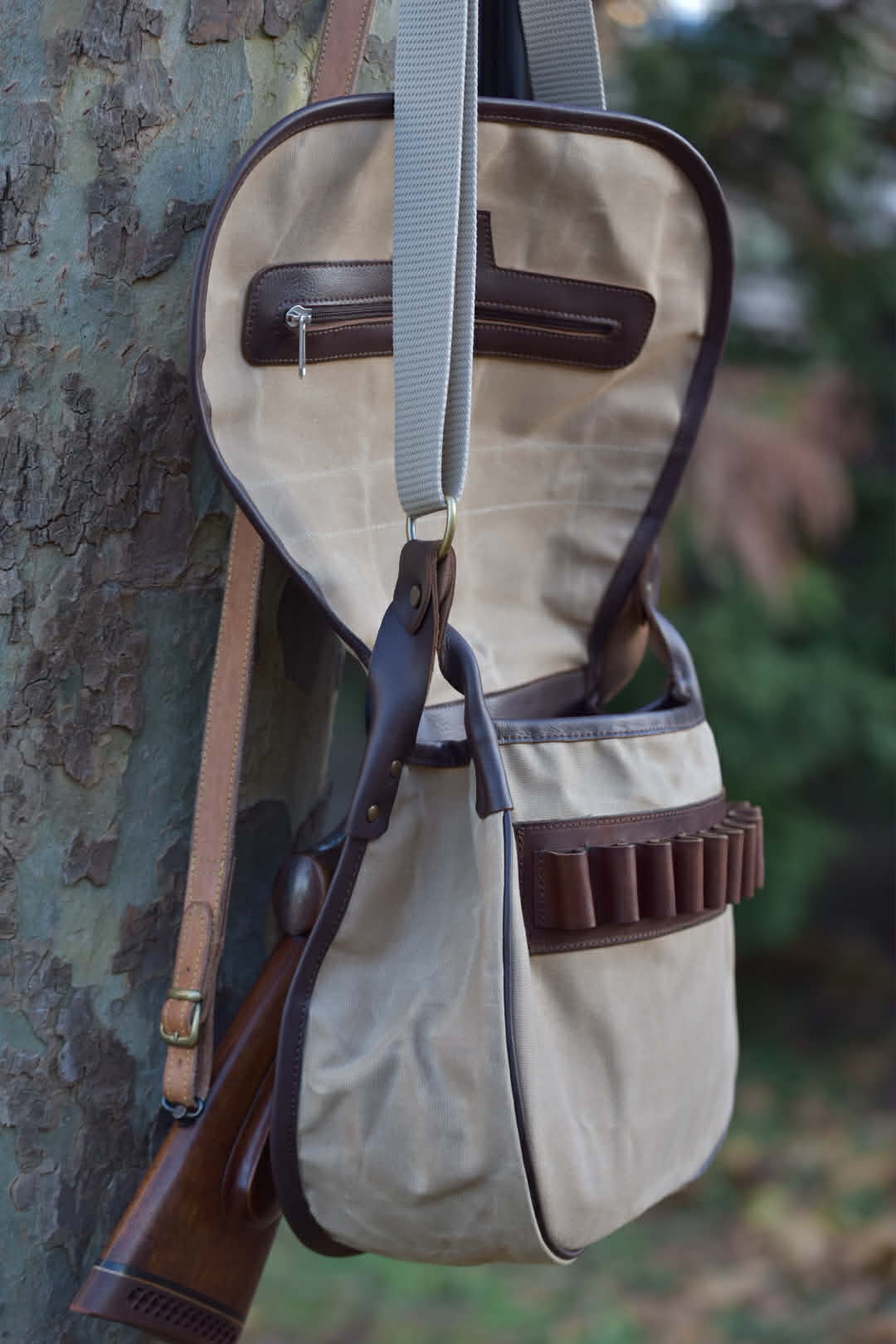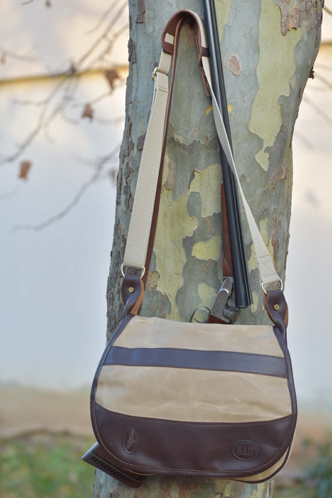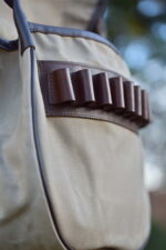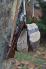 Χειροποίητη τσάντα κυνηγιού χιαστί Apertum, με κερωμένο καραβόπανο και δέρμα. Εσωτερικά με χώρισμα. Διατίθεται εσωτερικά φυσιγγιοθήκη 5 θέσεων και εξωτερικά 10 θέσεων. Σε χρώμα χακί και μπεζ.
